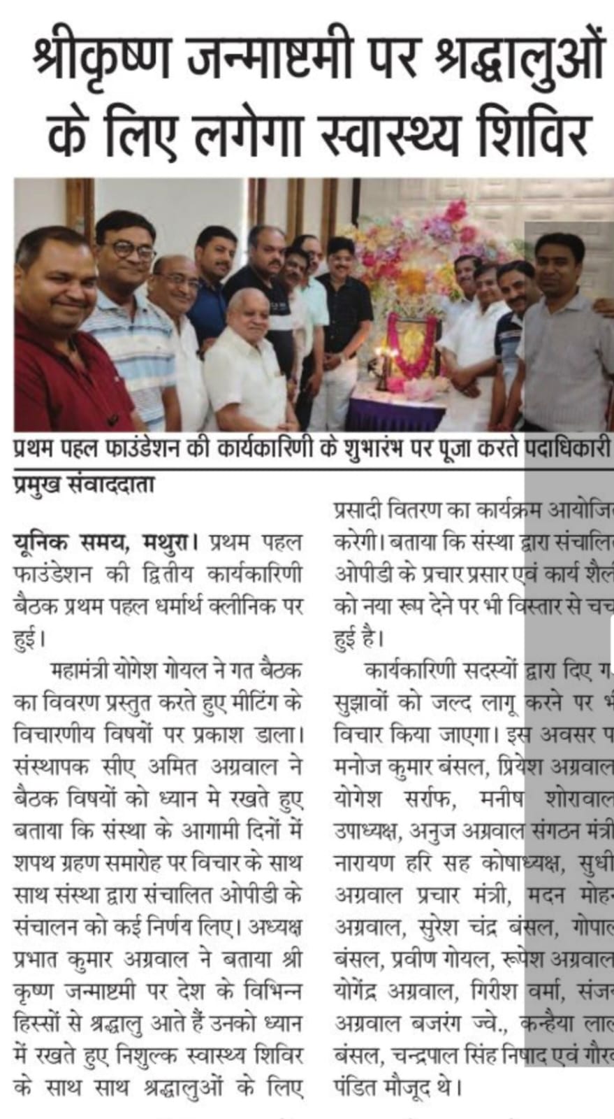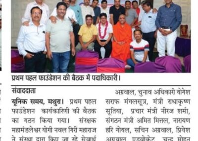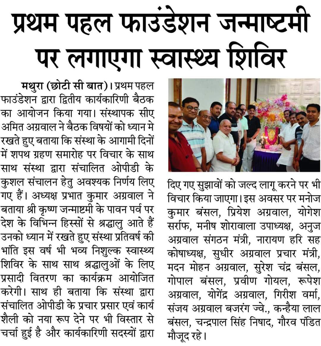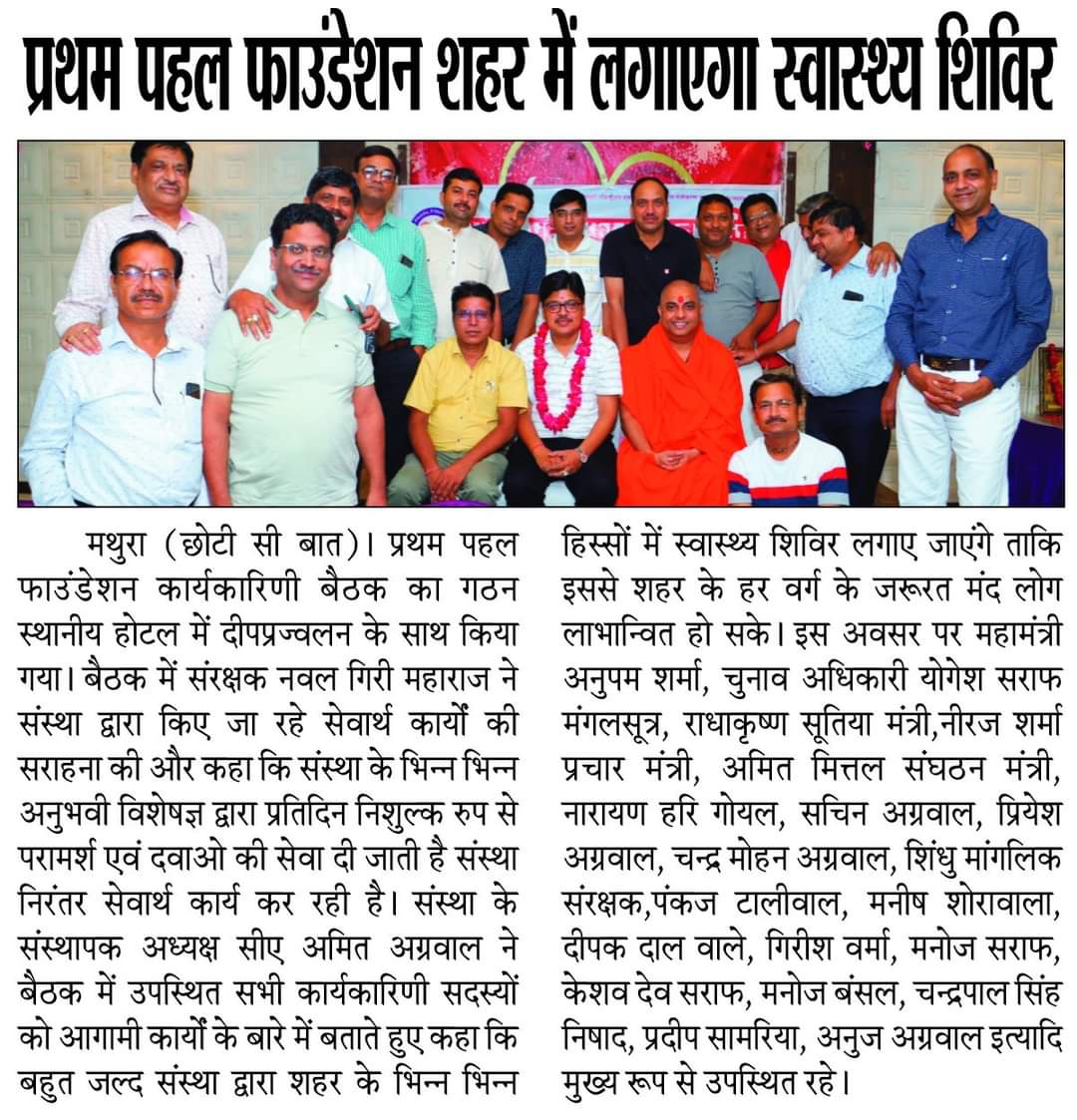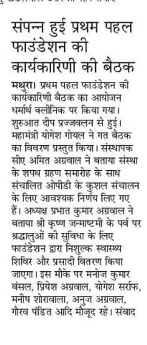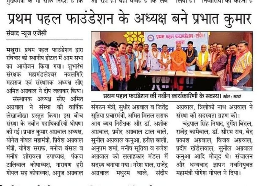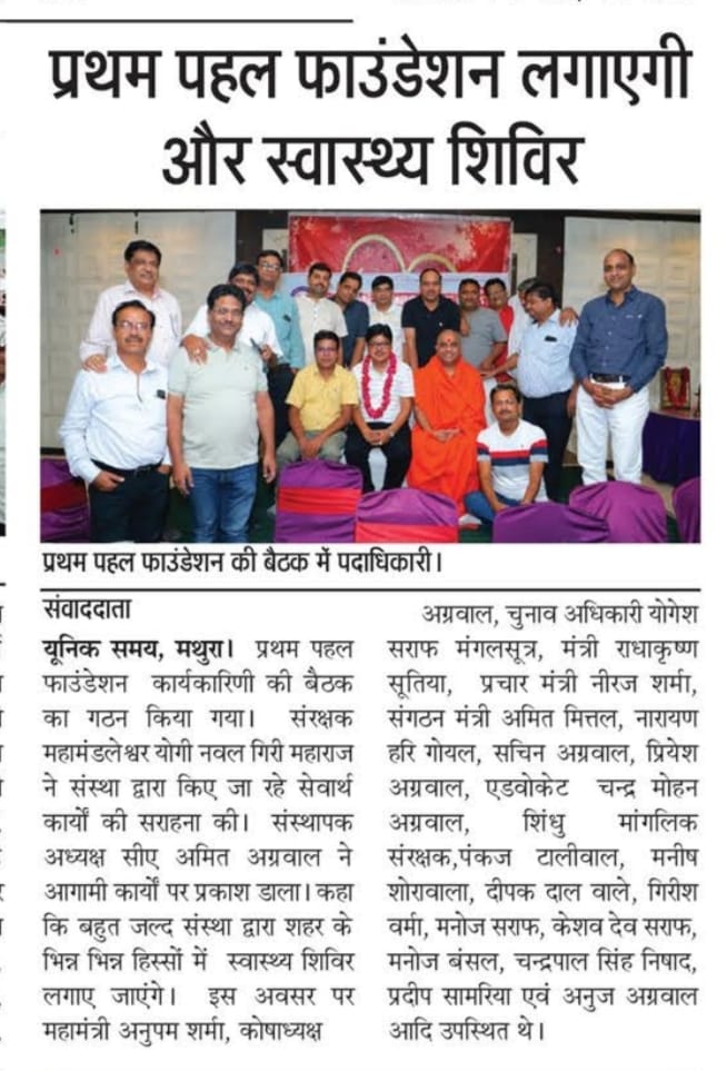 दिनांक 14 मई को प्रथम पहल फाउंडेशन रजि मथुरा द्वारा 2023-2024 की प्रथम कार्यकारिणी बैठक का गठन स्थानीय अग्रवाल होटल मिर्ची nh2 मथुरा पर आयोजन किया गया मीटिंग का शुभारंभ संस्थापक अध्यक्ष सीए अमित अग्रवाल, संरक्षक महामंडलेश्वर योगी श्रीनवलगिरी जी महाराज, महामंत्री अनुपम शर्मा, कोषाध्यक्ष प्रमोद अग्रवाल टाल वाले, पंकज पालीवाल, दुर्गेश बिंदल प्रेस वाले, सुनील अग्रवाल कनुआ, योगेश सराफ मंगलसूत्र, विजय बंसल, अनुज अग्रवाल, मनोज कुमार बंसल, यू.के. बंसल, मदन मोहन अग्रवाल, राजीव गुप्ता, सुधीर अग्रवाल, राधाकृष्ण सूतिया मंत्री इत्यादि ने दीपप्रज्ज्वन के साथ किया गया।