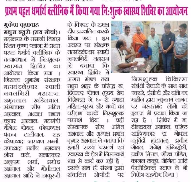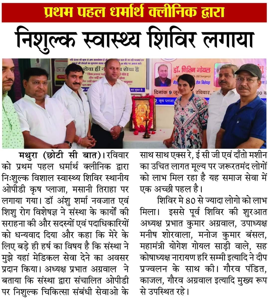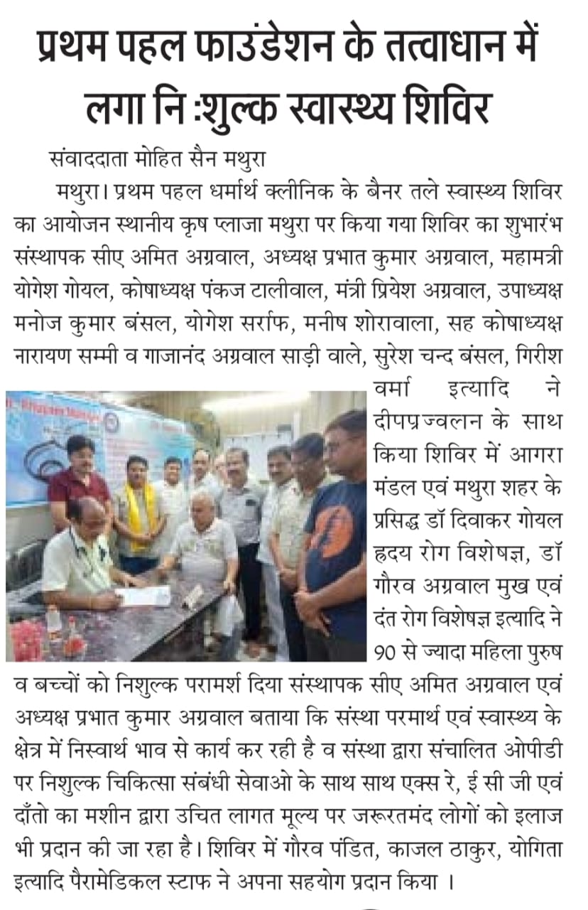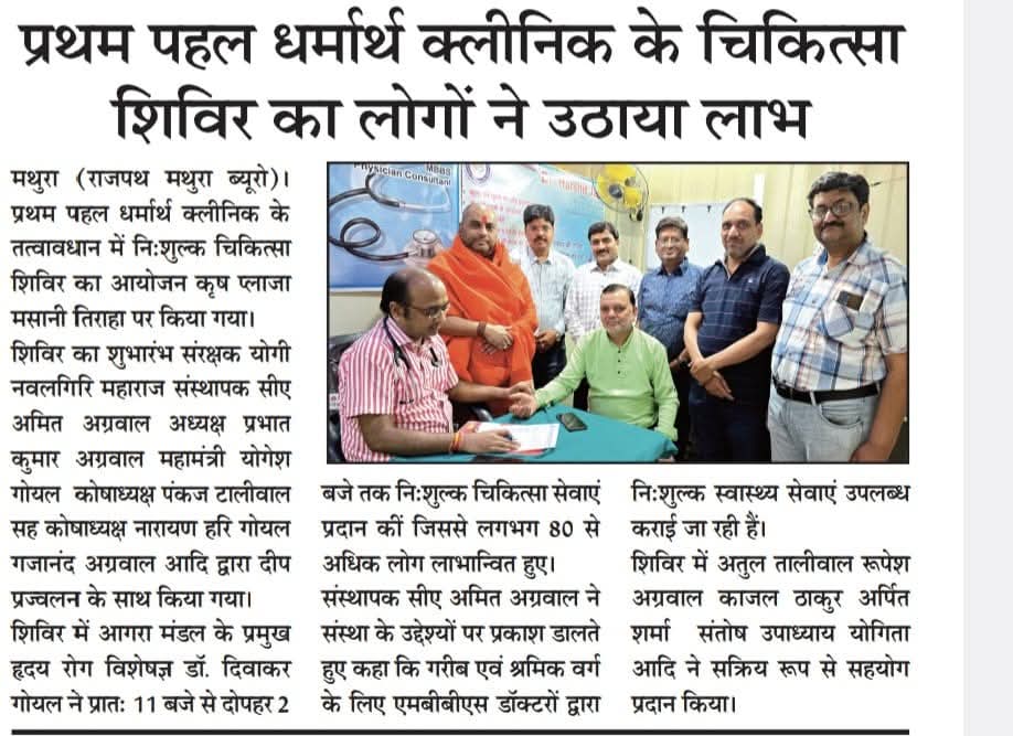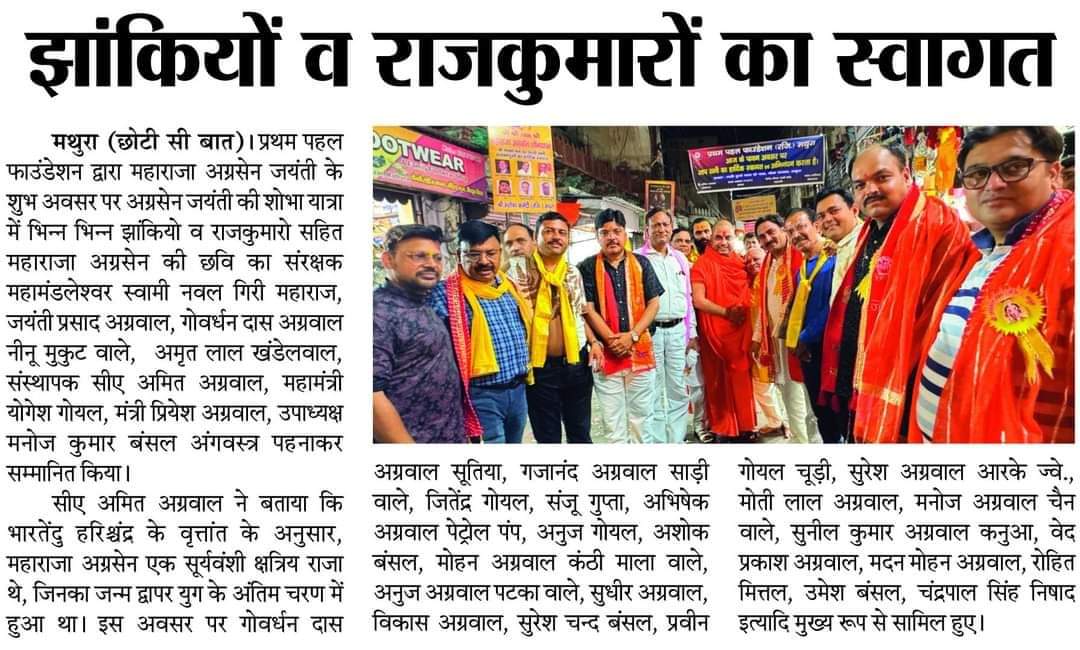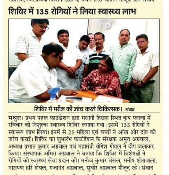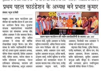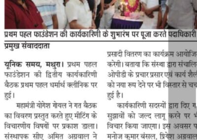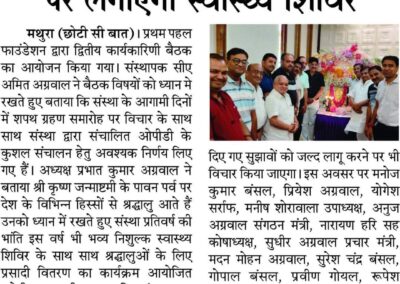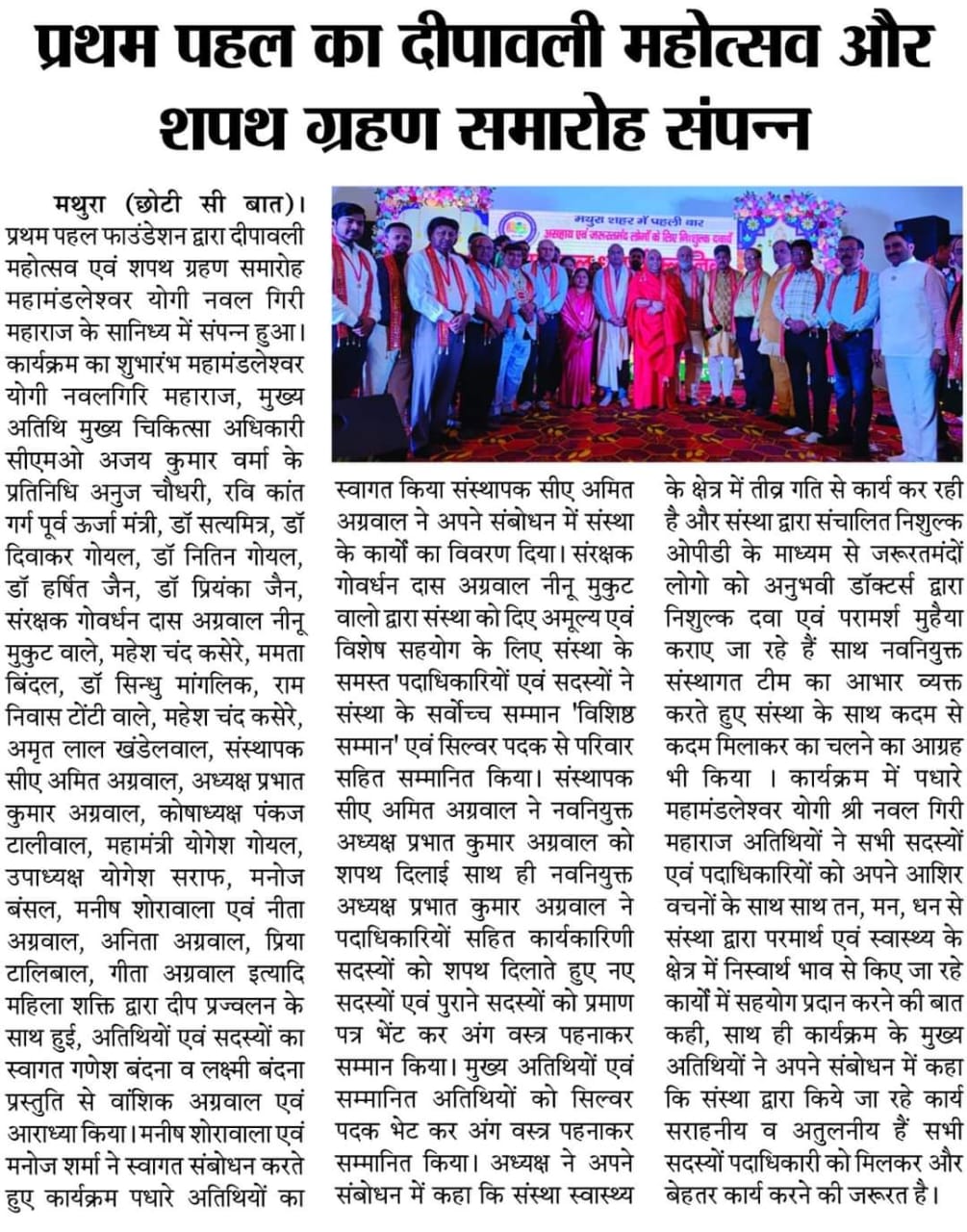 दिनांक 14 मई को प्रथम पहल फाउंडेशन रजि मथुरा द्वारा 2023-2024 की प्रथम कार्यकारिणी बैठक का गठन स्थानीय अग्रवाल होटल मिर्ची nh2 मथुरा पर आयोजन किया गया मीटिंग का शुभारंभ संस्थापक अध्यक्ष सीए अमित अग्रवाल, संरक्षक महामंडलेश्वर योगी श्रीनवलगिरी जी महाराज, महामंत्री अनुपम शर्मा, कोषाध्यक्ष प्रमोद अग्रवाल टाल वाले, पंकज पालीवाल, दुर्गेश बिंदल प्रेस वाले, सुनील अग्रवाल कनुआ, योगेश सराफ मंगलसूत्र, विजय बंसल, अनुज अग्रवाल, मनोज कुमार बंसल, यू.के. बंसल, मदन मोहन अग्रवाल, राजीव गुप्ता, सुधीर अग्रवाल, राधाकृष्ण सूतिया मंत्री इत्यादि ने दीपप्रज्ज्वन के साथ किया गया।