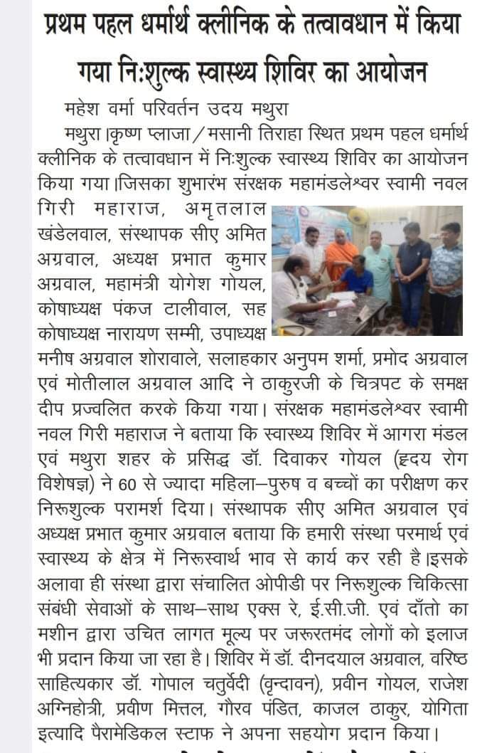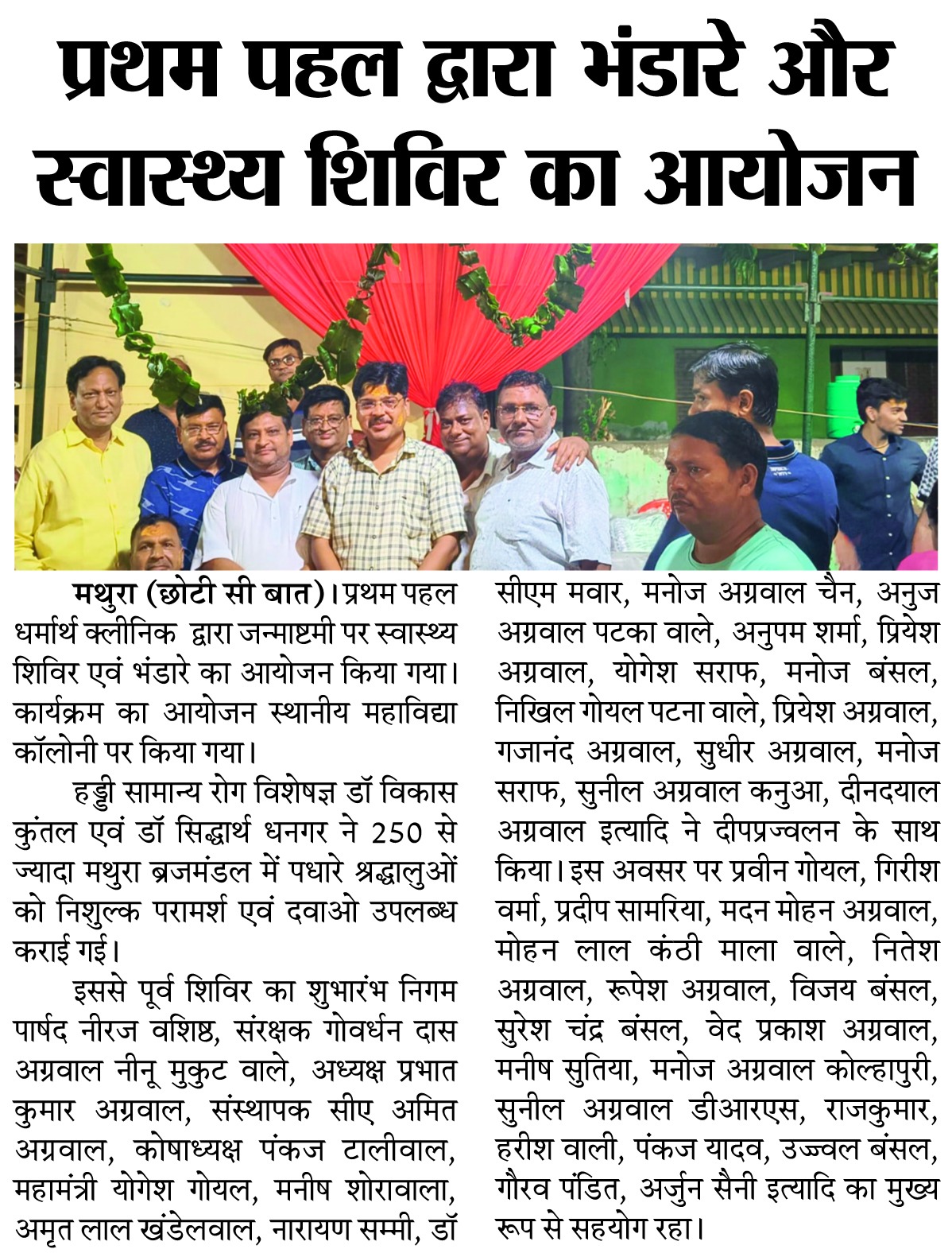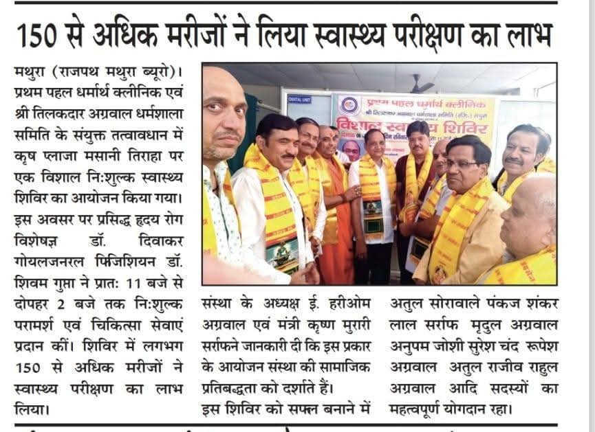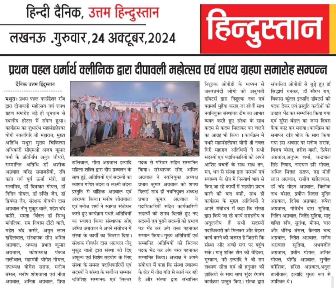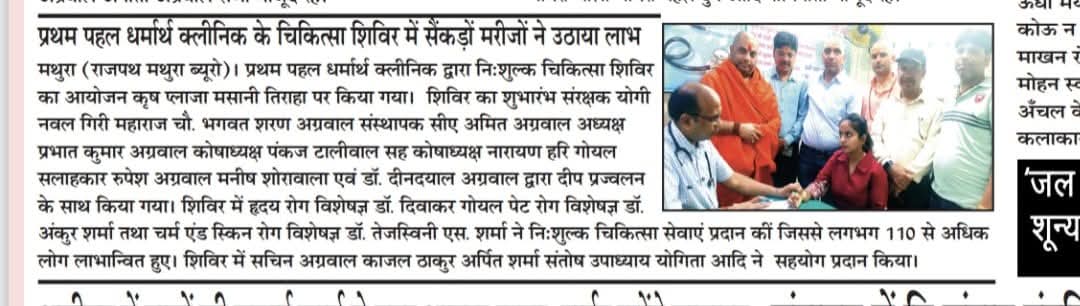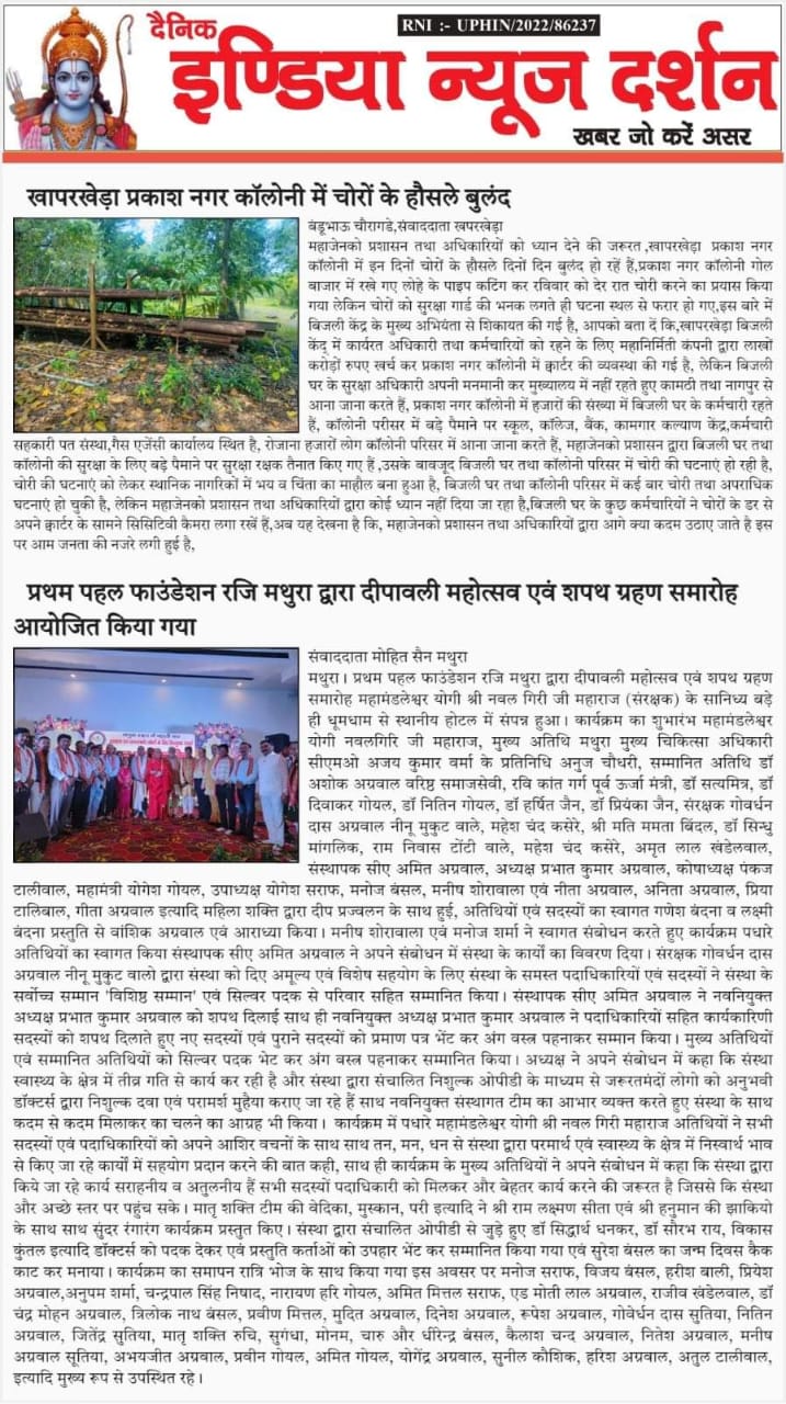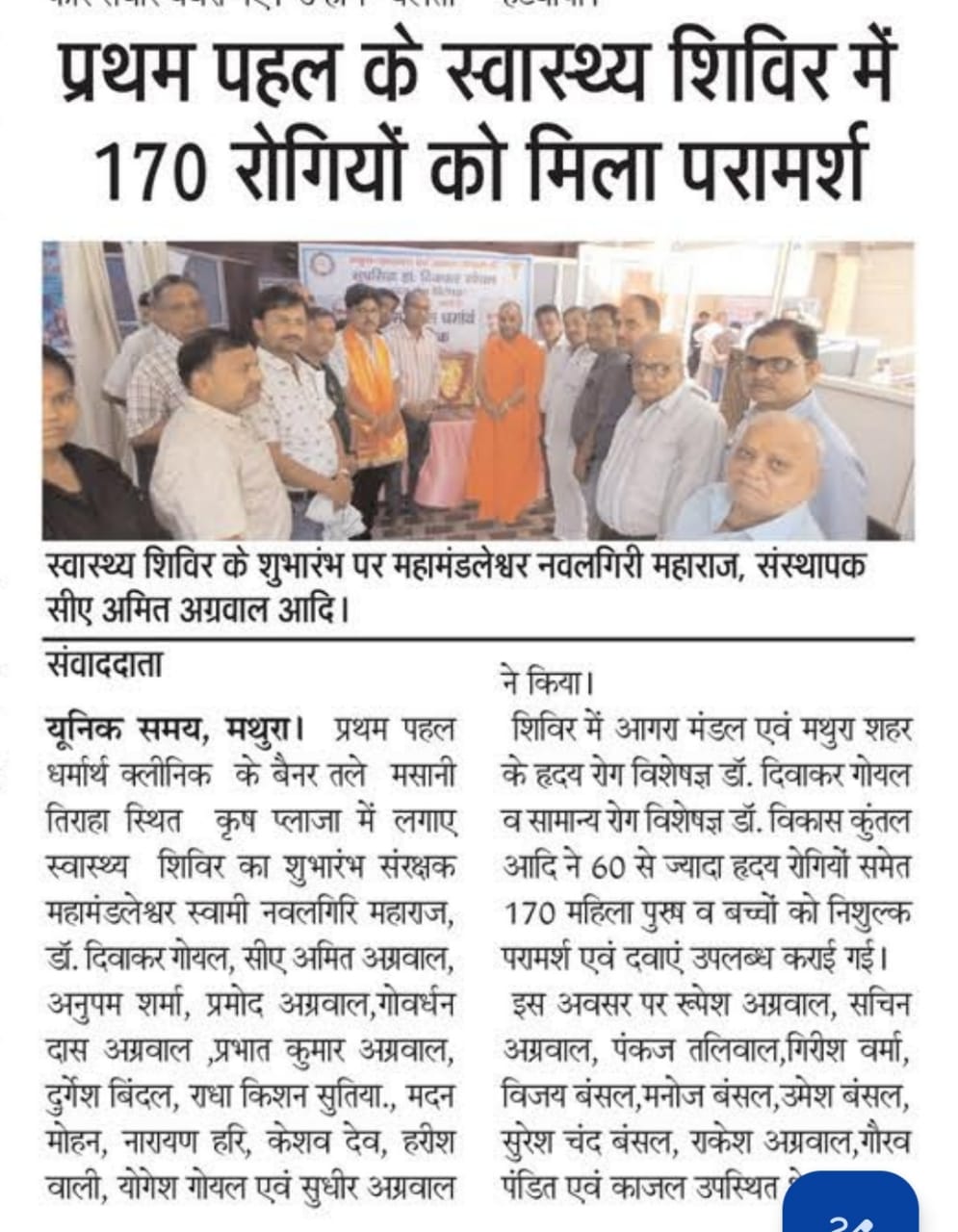 दिनांक 14 मई को प्रथम पहल फाउंडेशन रजि मथुरा द्वारा 2023-2024 की प्रथम कार्यकारिणी बैठक का गठन स्थानीय अग्रवाल होटल मिर्ची nh2 मथुरा पर आयोजन किया गया मीटिंग का शुभारंभ संस्थापक अध्यक्ष सीए अमित अग्रवाल, संरक्षक महामंडलेश्वर योगी श्रीनवलगिरी जी महाराज, महामंत्री अनुपम शर्मा, कोषाध्यक्ष प्रमोद अग्रवाल टाल वाले, पंकज पालीवाल, दुर्गेश बिंदल प्रेस वाले, सुनील अग्रवाल कनुआ, योगेश सराफ मंगलसूत्र, विजय बंसल, अनुज अग्रवाल, मनोज कुमार बंसल, यू.के. बंसल, मदन मोहन अग्रवाल, राजीव गुप्ता, सुधीर अग्रवाल, राधाकृष्ण सूतिया मंत्री इत्यादि ने दीपप्रज्ज्वन के साथ किया गया।