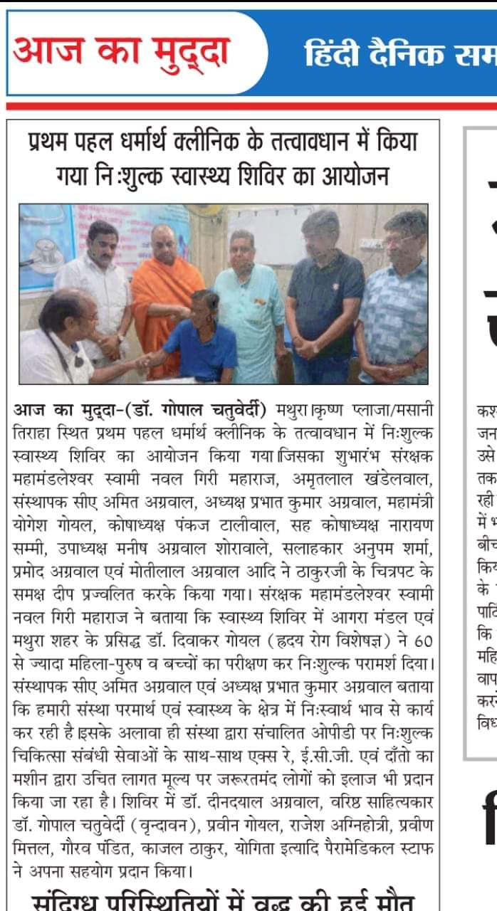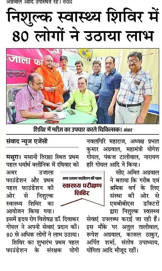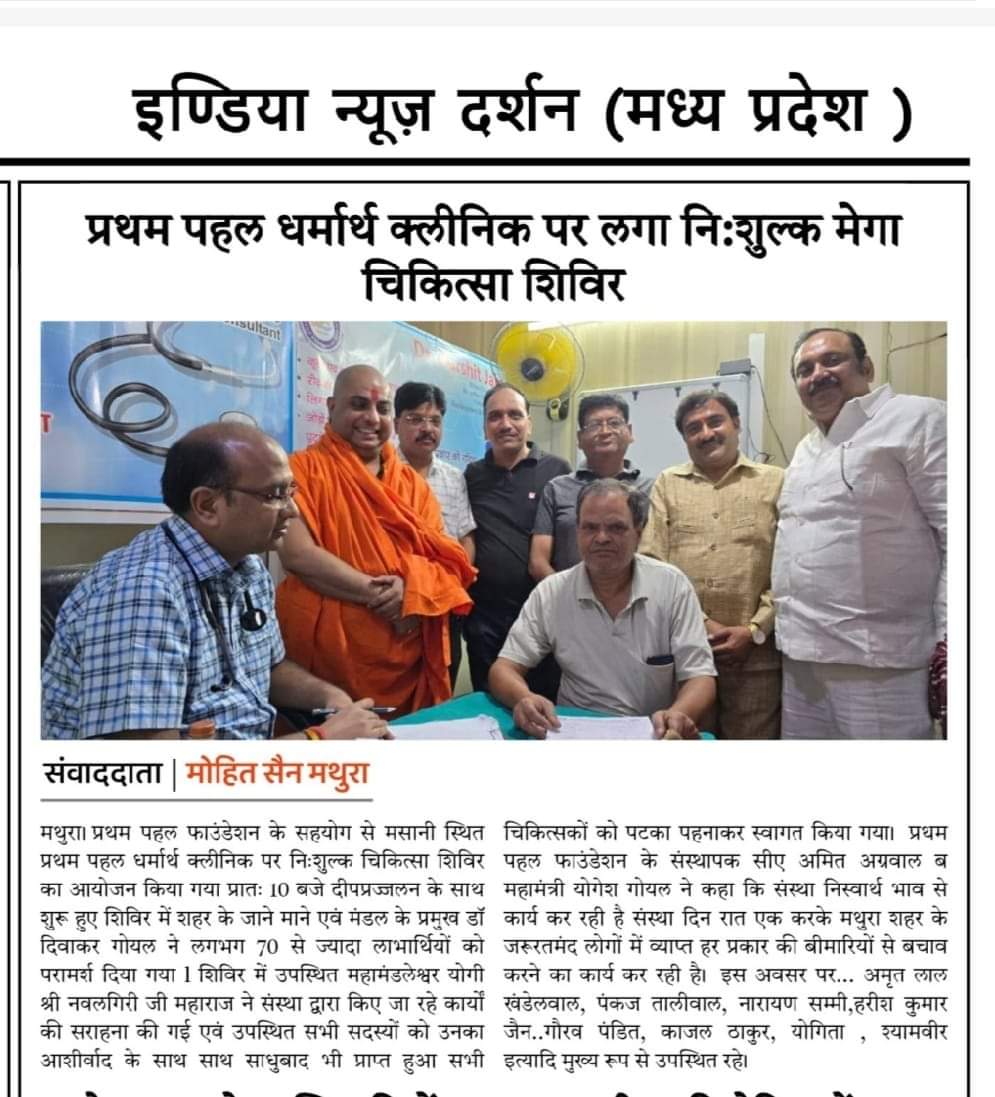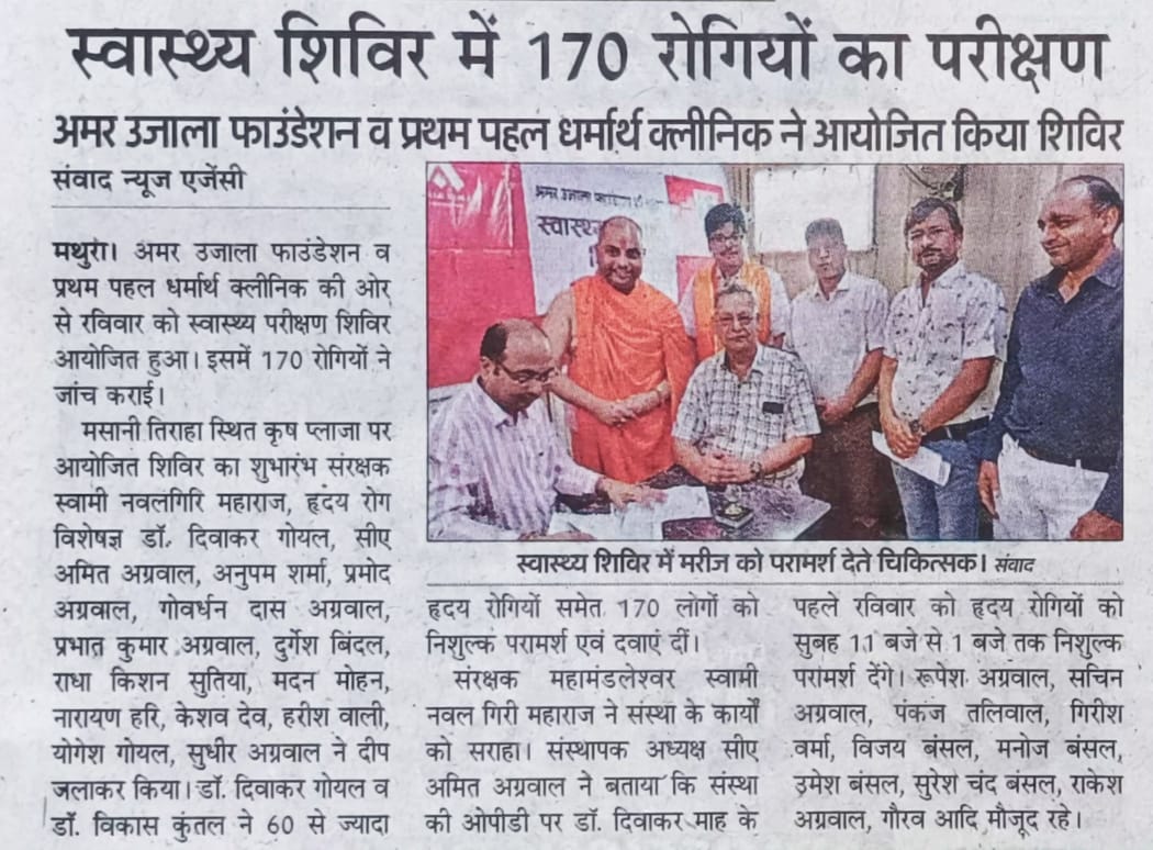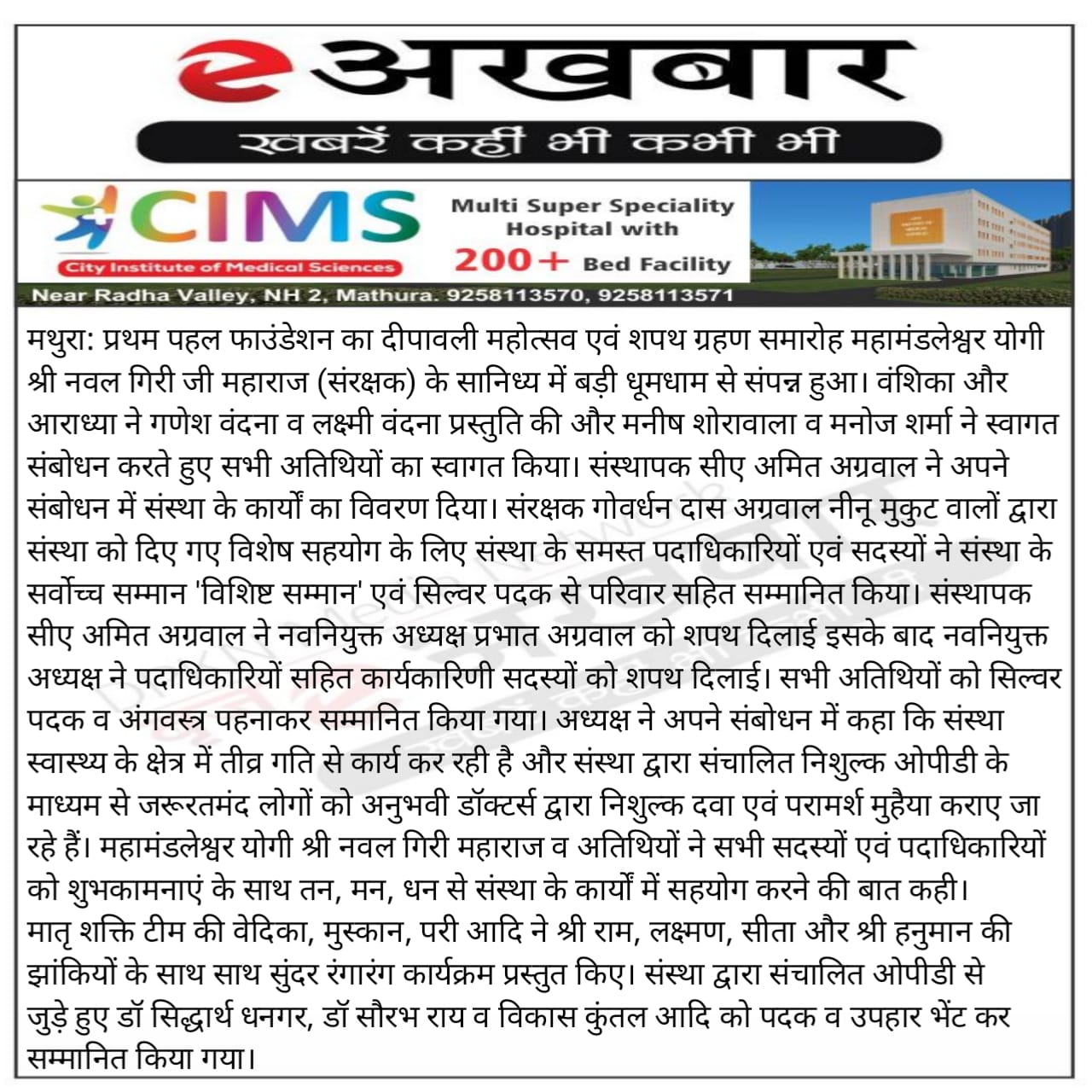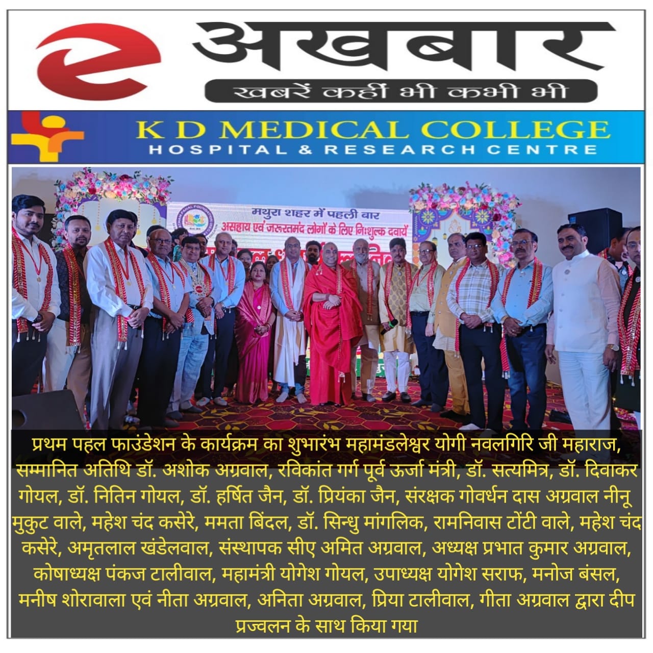 दिनांक 14 मई को प्रथम पहल फाउंडेशन रजि मथुरा द्वारा 2023-2024 की प्रथम कार्यकारिणी बैठक का गठन स्थानीय अग्रवाल होटल मिर्ची nh2 मथुरा पर आयोजन किया गया मीटिंग का शुभारंभ संस्थापक अध्यक्ष सीए अमित अग्रवाल, संरक्षक महामंडलेश्वर योगी श्रीनवलगिरी जी महाराज, महामंत्री अनुपम शर्मा, कोषाध्यक्ष प्रमोद अग्रवाल टाल वाले, पंकज पालीवाल, दुर्गेश बिंदल प्रेस वाले, सुनील अग्रवाल कनुआ, योगेश सराफ मंगलसूत्र, विजय बंसल, अनुज अग्रवाल, मनोज कुमार बंसल, यू.के. बंसल, मदन मोहन अग्रवाल, राजीव गुप्ता, सुधीर अग्रवाल, राधाकृष्ण सूतिया मंत्री इत्यादि ने दीपप्रज्ज्वन के साथ किया गया।