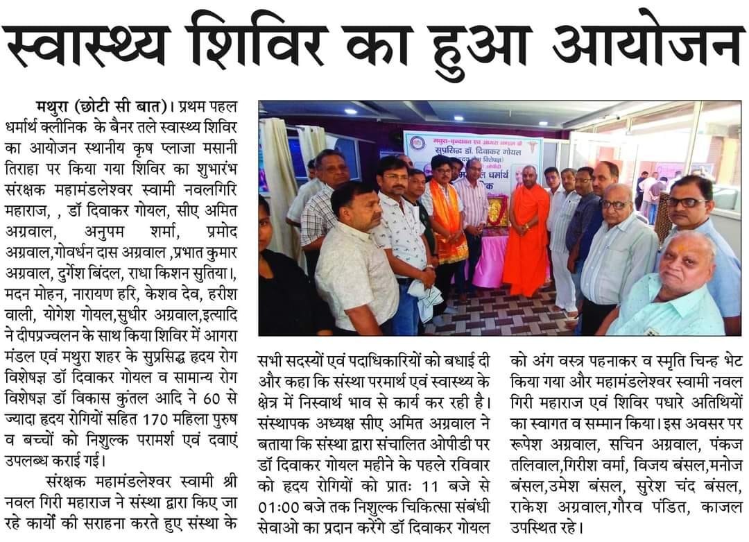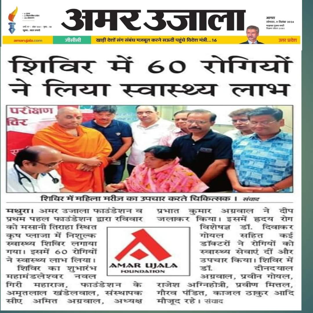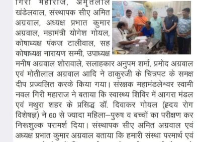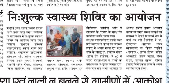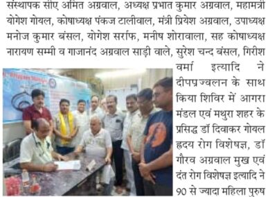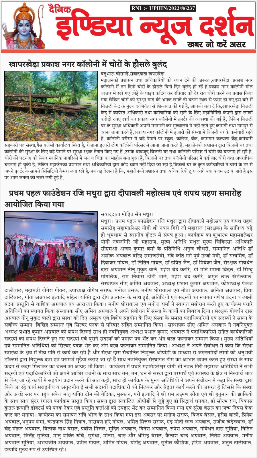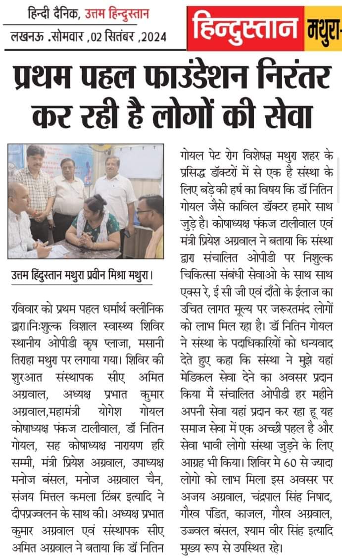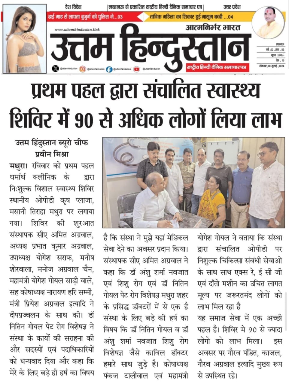दिनांक 14 मई को प्रथम पहल फाउंडेशन रजि मथुरा द्वारा 2023-2024 की प्रथम कार्यकारिणी बैठक का गठन स्थानीय अग्रवाल होटल मिर्ची nh2 मथुरा पर आयोजन किया गया मीटिंग का शुभारंभ संस्थापक अध्यक्ष सीए अमित अग्रवाल, संरक्षक महामंडलेश्वर योगी श्रीनवलगिरी जी महाराज, महामंत्री अनुपम शर्मा, कोषाध्यक्ष प्रमोद अग्रवाल टाल वाले, पंकज पालीवाल, दुर्गेश बिंदल प्रेस वाले, सुनील अग्रवाल कनुआ, योगेश सराफ मंगलसूत्र, विजय बंसल, अनुज अग्रवाल, मनोज कुमार बंसल, यू.के. बंसल, मदन मोहन अग्रवाल, राजीव गुप्ता, सुधीर अग्रवाल, राधाकृष्ण सूतिया मंत्री इत्यादि ने दीपप्रज्ज्वन के साथ किया गया।